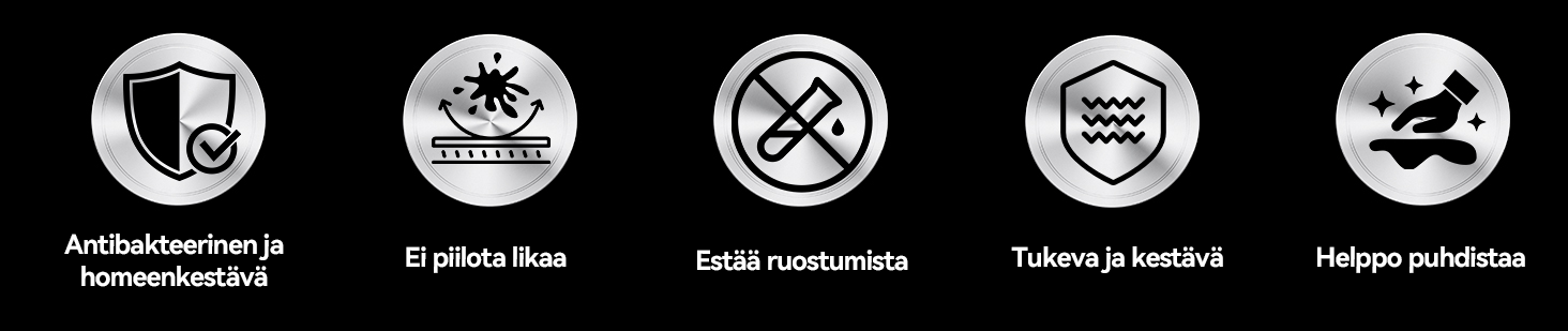 - Huokoton pinta: Sileä ja huokoton pinta on erittäin helppo puhdistaa – ei tahroja, ei hajuja.