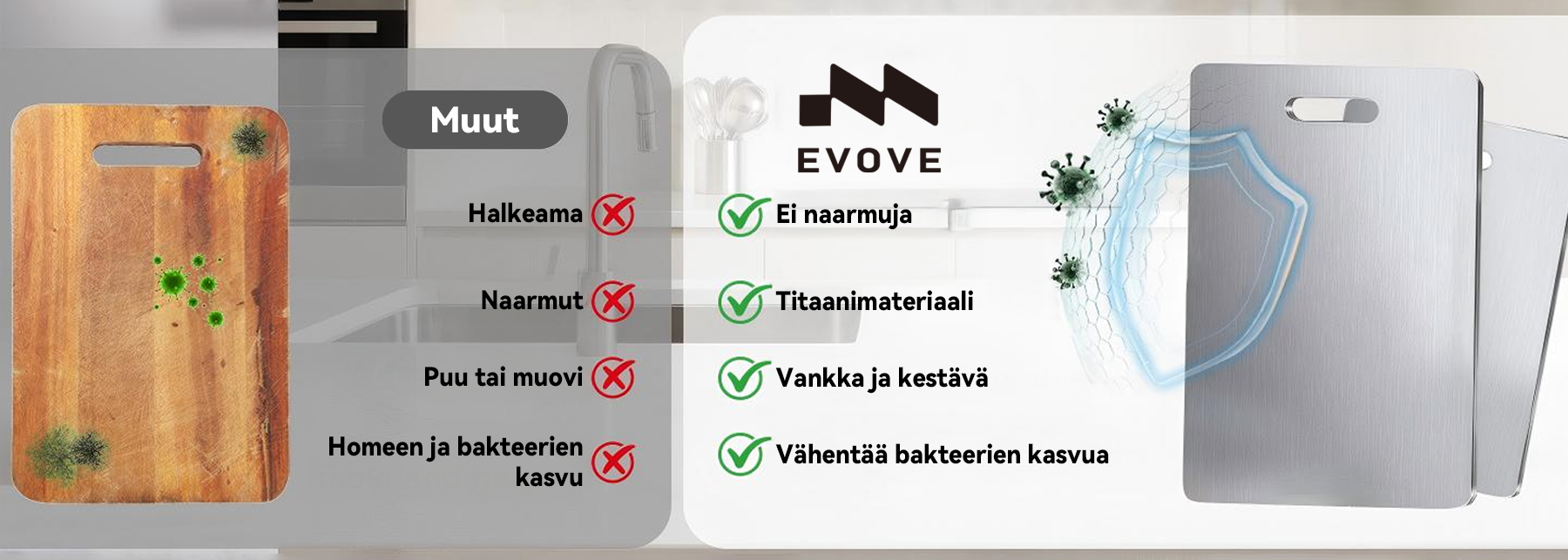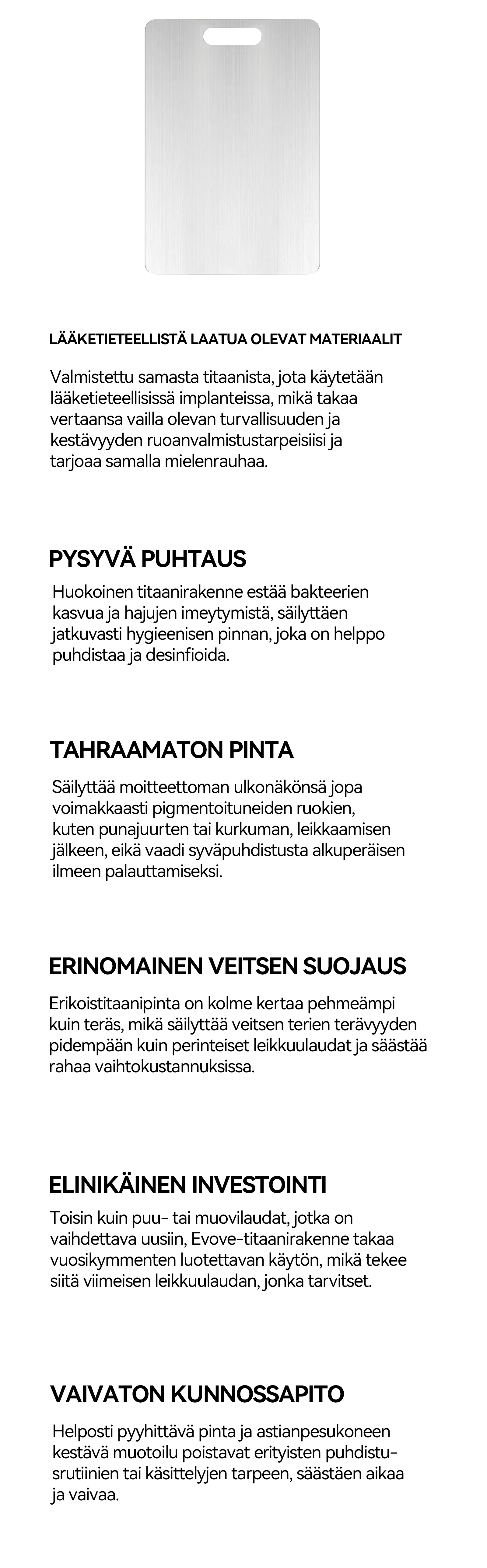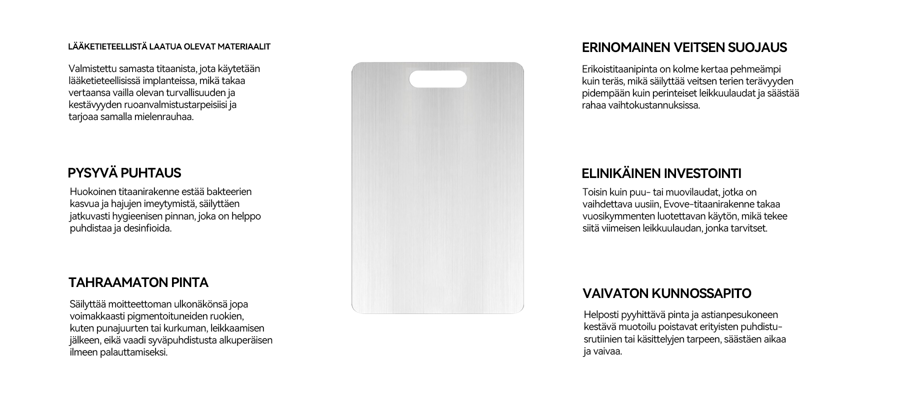 Siksi syntyi Evove-titaanileikkuulauta. Se on valmistettu korkealaatuisesta titaanista, se on huokoton, hygieeninen ja tehty kestämään. Sen sileä pinta tekee jokaisesta leikkauksesta vaivattoman. Evoven lupaus on yksinkertainen: tuoda hygieniaa ja kestävyyttä keittiöösi, jotta voit valmistaa aterioita helposti ja luottavaisin mielin.