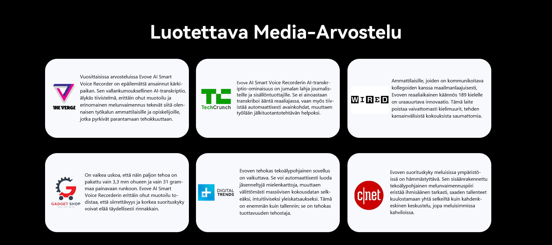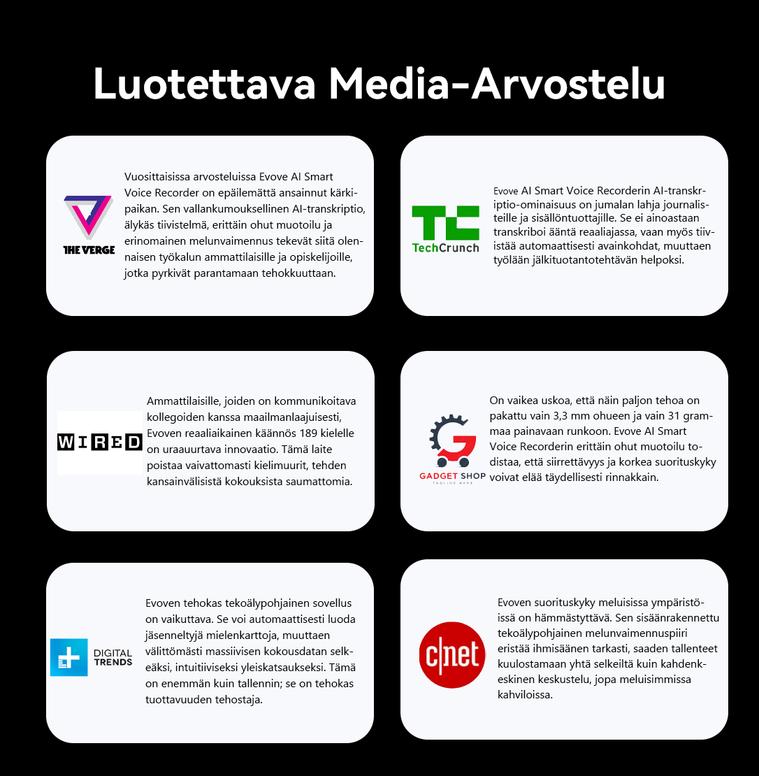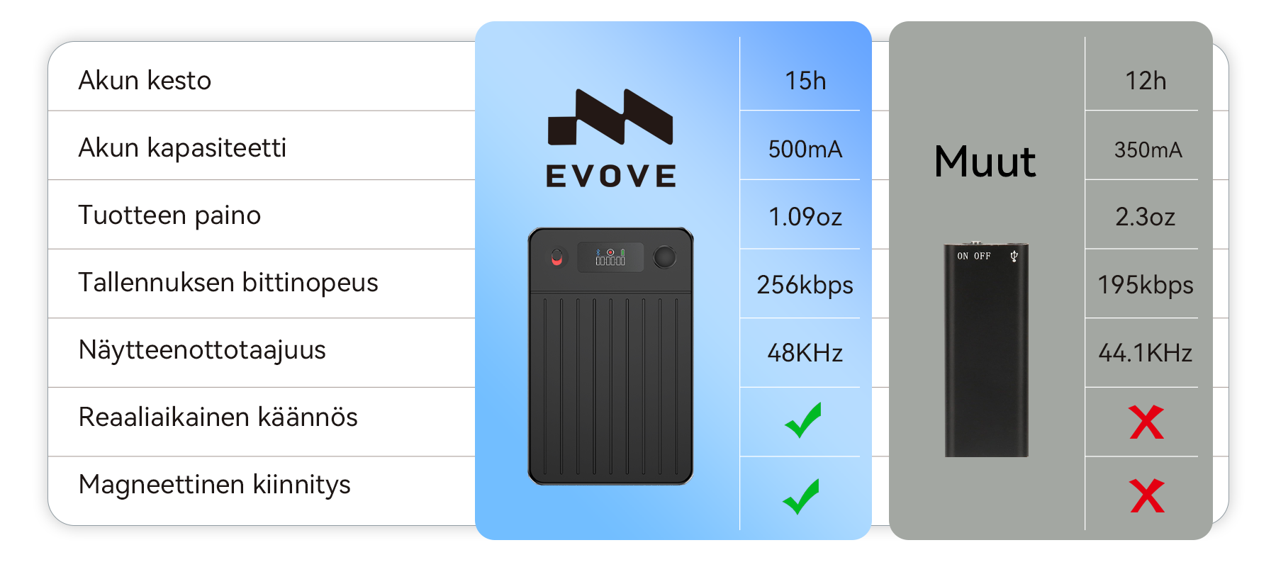 Näin syntyi Evove AI Smart Voice Recorder. Siinä yhdistyvät tehokas tekoälymoottori, reaaliaikainen puhtaaksikirjoitus ja ultraohut runko sisäänrakennetulla kohinanvaimennusteknologialla. Tämä on Evoven ydinlupaus: vapauttaa mielesi ja antaa sinun keskittyä siihen, mikä on todella tärkeää.