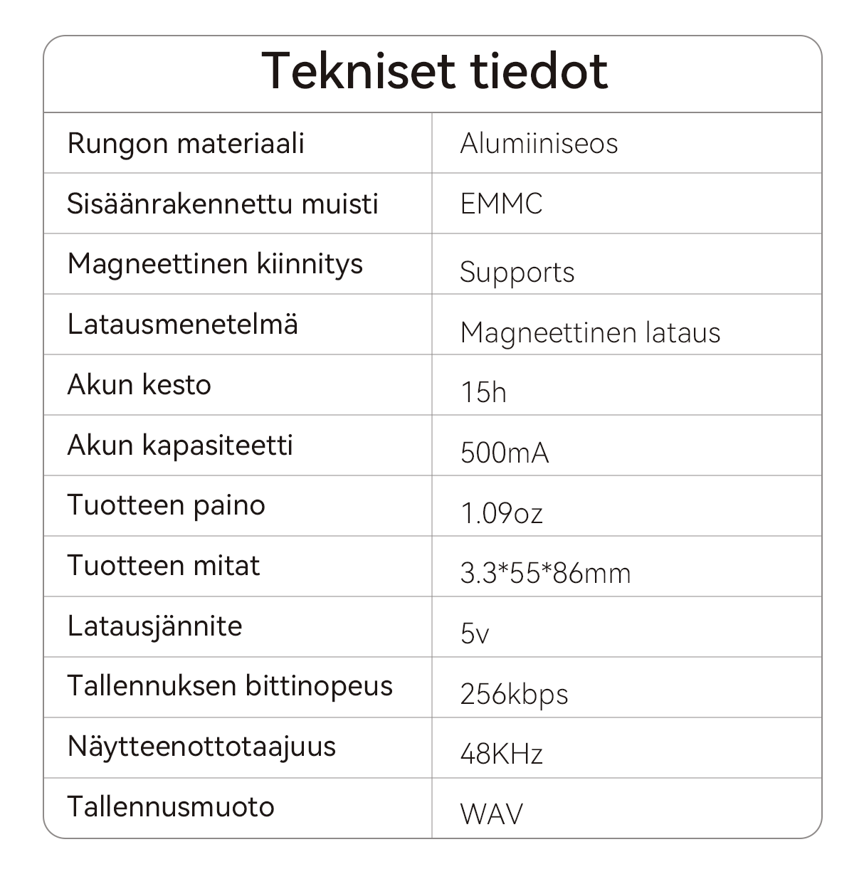 - Puheluiden tallennus: Magneettisen kiinnityksen ansiosta puheluiden ja kokousten tallentaminen on vaivatonta.